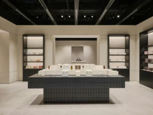 The material contrast creates a space that feels minimal yet welcoming refined but never cold. It’s the kind of environment that makes you want to linger, browse slowly, and maybe try on “just one more thing.”